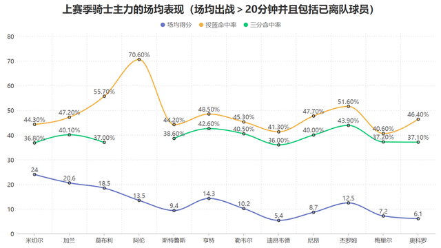 斯特鲁斯上赛季场均9.4分,两项命中率分别为44.2%与38.6%,实际上从得分产量与效率上来看他并不算骑士队内最高效的射手,除了核心球员外,无论是亨特、勒韦尔还是杰罗姆的产量效率均胜于他,但从适配骑士进攻体系与特定时刻时他并不输其余队友:
